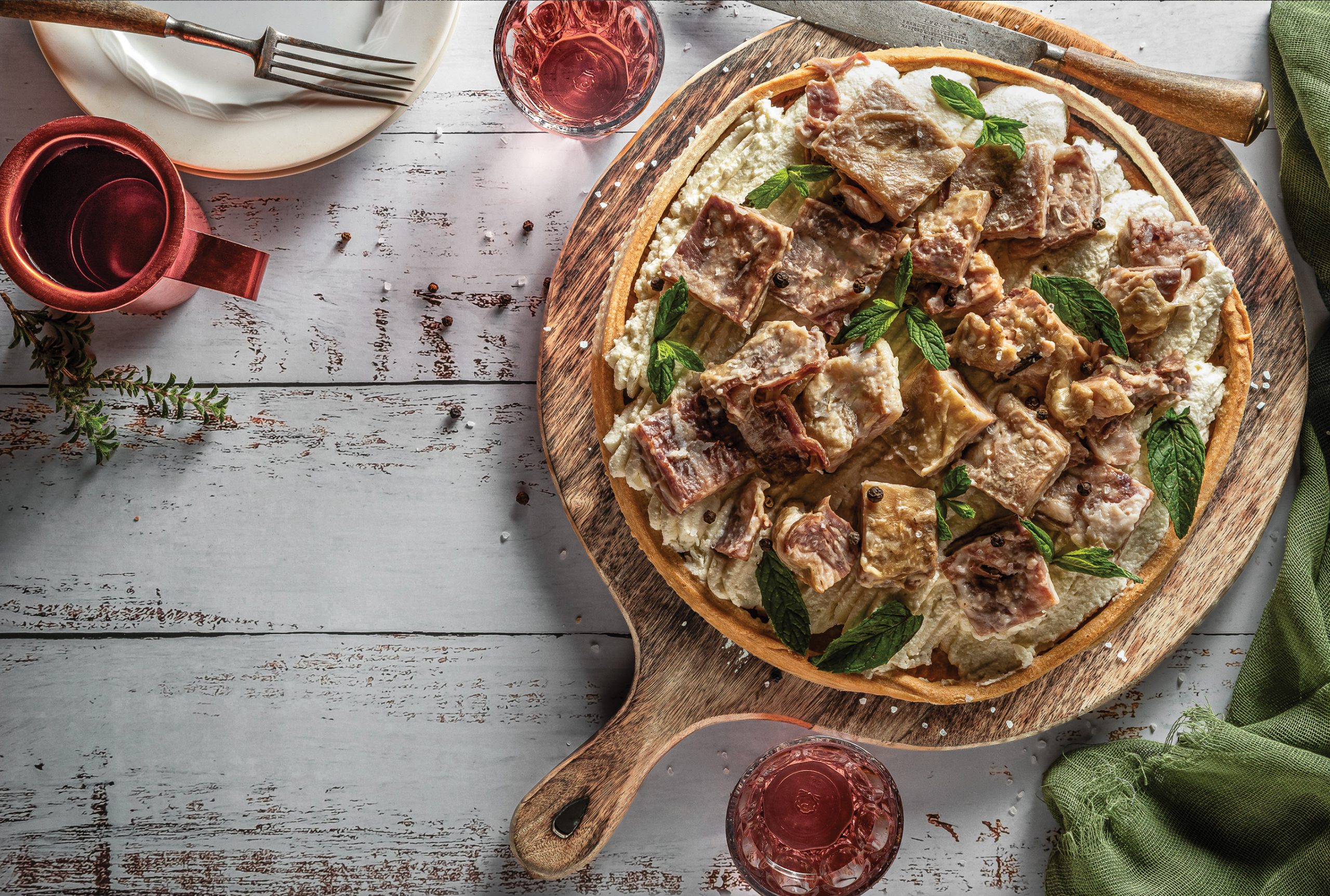 Τέλος, στήνουμε την τάρτα προσθέτοντας την κρέμα και το αρνί.
